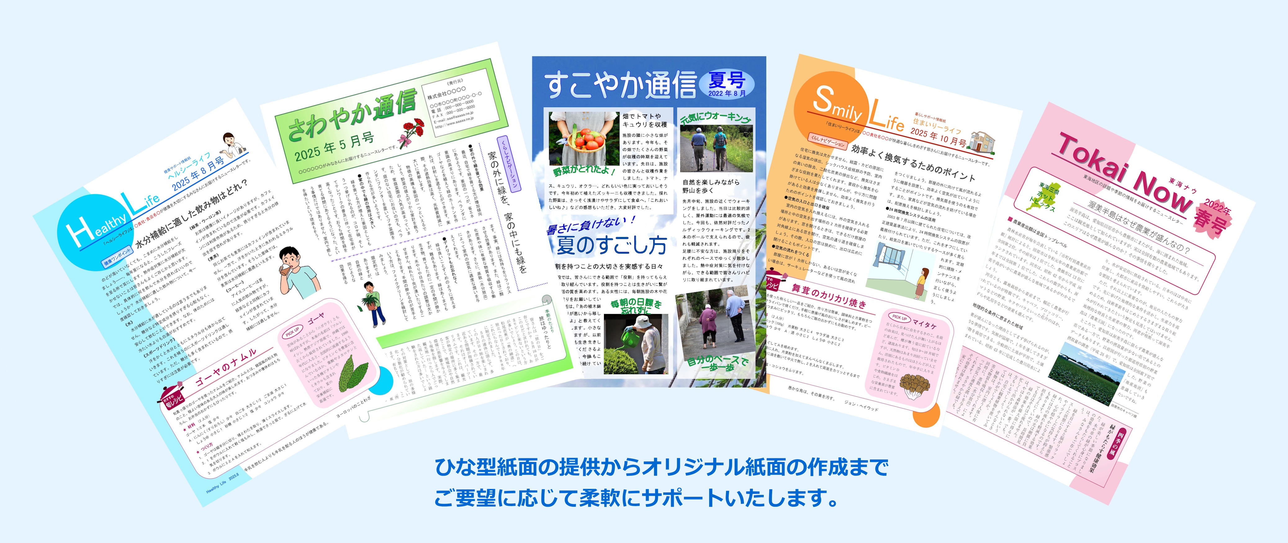 オフィスOKは、2010年の創業から15年以上にわたり、さまざまな事業者様のニュースレターを作成してまいりました。ひな型(テンプレート)の販売からオリジナル紙面の企画・執筆・デザインまで、お客様のご要望に柔軟に対応いたしております。